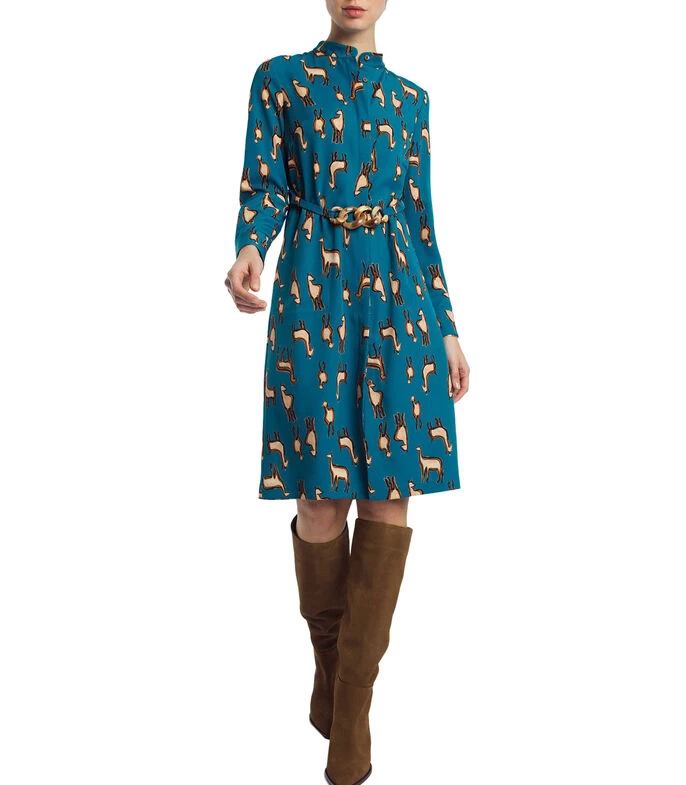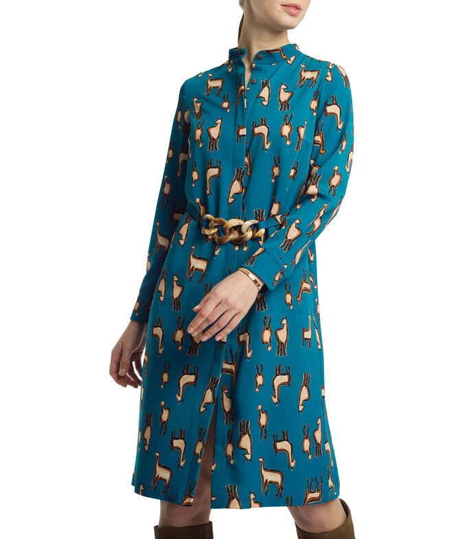 Vestido Alba Conde midi de corte recto en tejido de punto, diseño de animales, botonadura oculta, bolsillos en costados y cinturón con cadena.