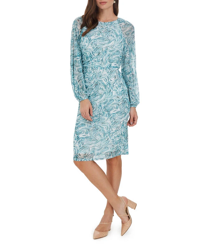Vestido Phase Eight corto de corte ajustado en tejido de punto semitransparente, cuello redondo, manga larga con elástico en puños, detalle fruncido en costado y cierre en espalda superior. Fondo a tono.