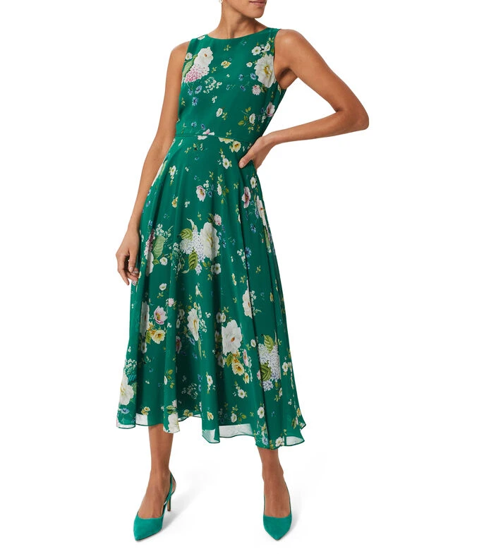 Vestido de fiesta largo Hobbs Carly, corte «A» en tejido plano, estampado floral, faldón amplio y abertura en espalda.