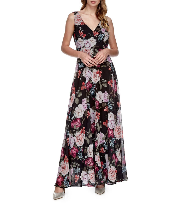 Vestido largo Massima de corte «A» en tejido plano floral, abertura al frente, tirantes anchos, ensamble de pantalón a contraste y cierre en espalda.
