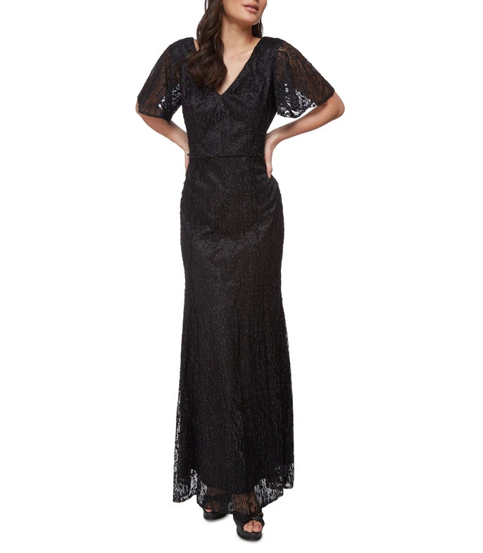 Vestido largo Massima, de corte «A» en tejido plano, diseño tipo glitter, forro visible a tono y cierre en espalda.