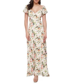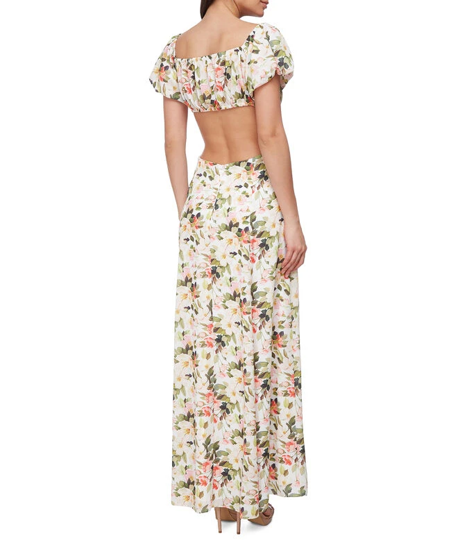 Vestido largo Massima de corte «A» en tejido plano, estampado de rosas, elástico en espalda y abertura decorativa.