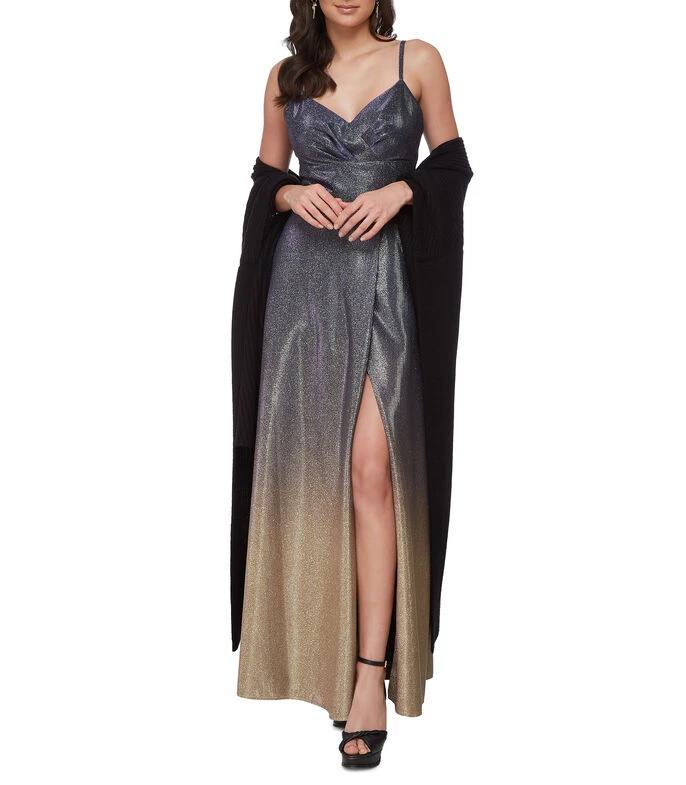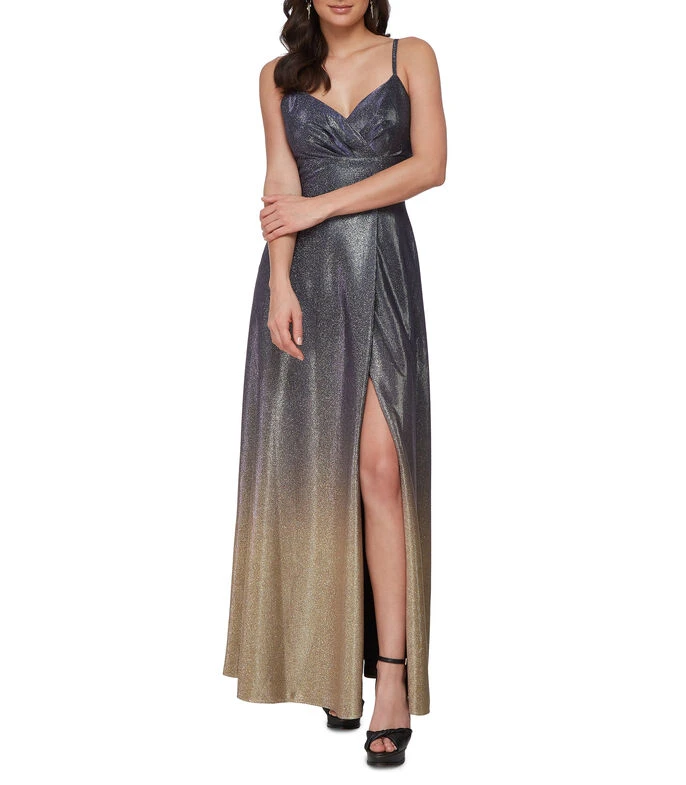 Vestido largo Massima de corte «A» en tejido plano, diseño tipo glitter, abertura en costado, tirantes delgados y cierre en espalda.