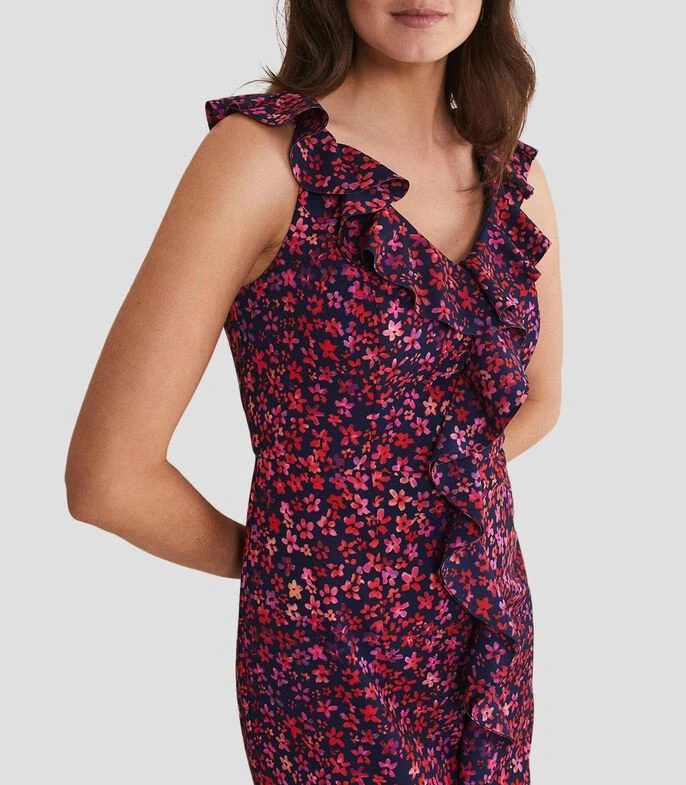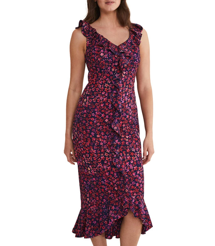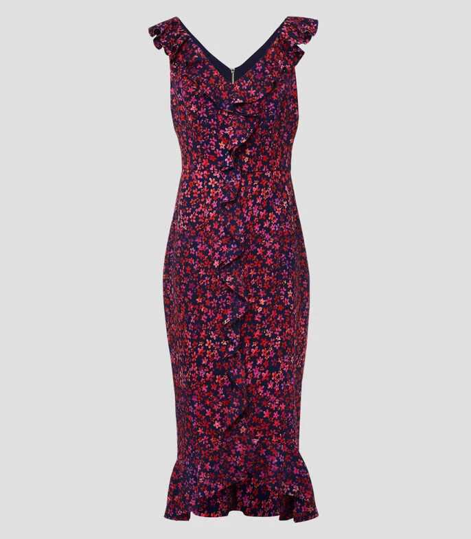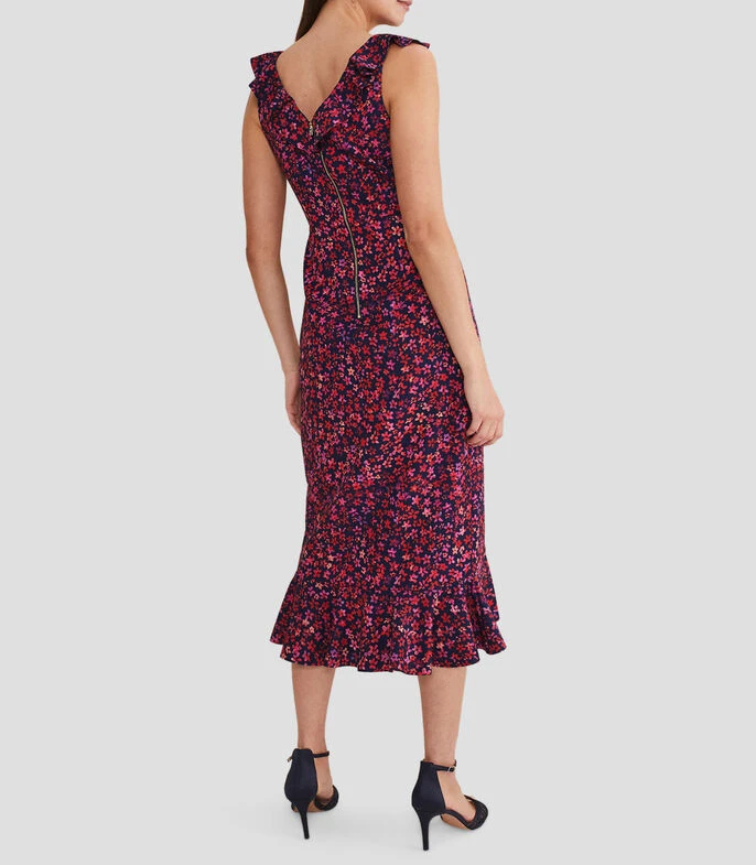 Vestido Phase Eight Viola midi, de corte ajustado en tejido de punto con flores, cuello V, holanes y cierre en espalda; Ajustado y favorecedor, este modelo te hará sentir y lucir lo mejor posible. Diseñado con un vibrante estampado floral, nuestro vestido Viola presenta detalles de holanes y está rematado con una falda estilo cola de pez. Combínalo con accesorios metálicos para atraer todas las miradas en tu próximo evento especial.