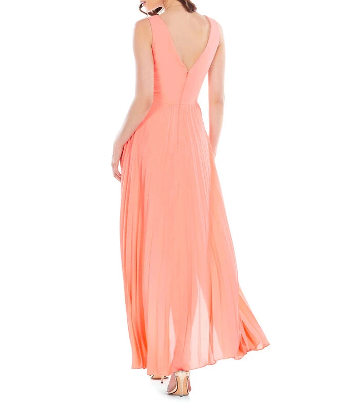 Vestido de fiesta tipo jumper Eva Brazzi Midi de corte A en tejido de punto, cuello V, faldón estilo high low, sobrefalda plisada, espalda en V y sin mangas.