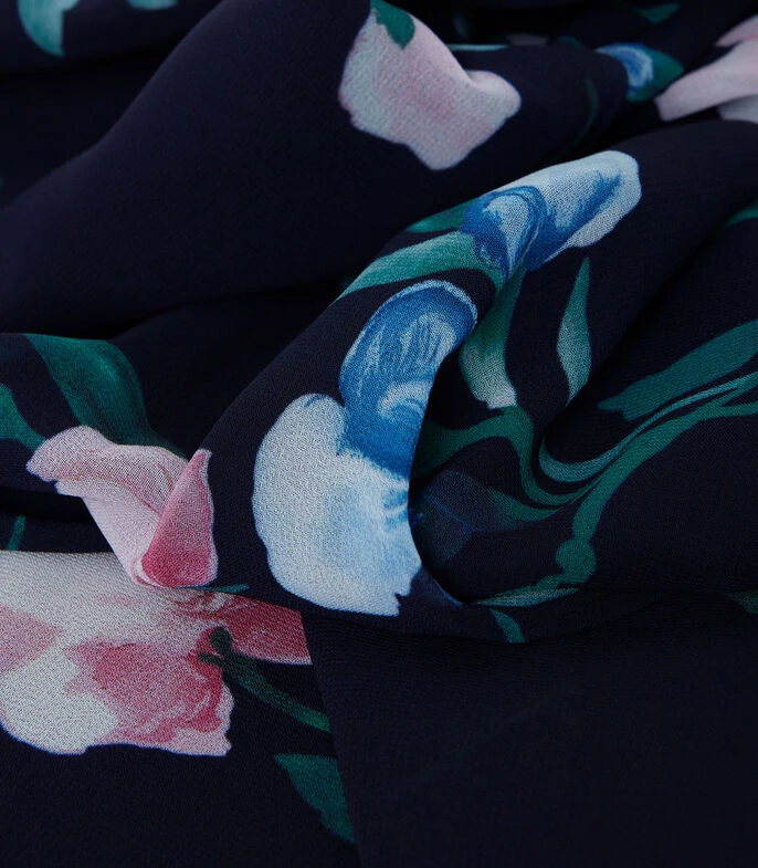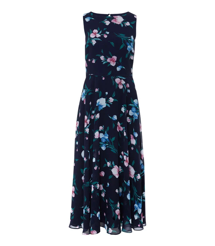 Vestido Hobbs largo de corte A en tejido de punto con diseño de flores en mosaico, cuello redondo, sin mangas y broche en parte trasera.