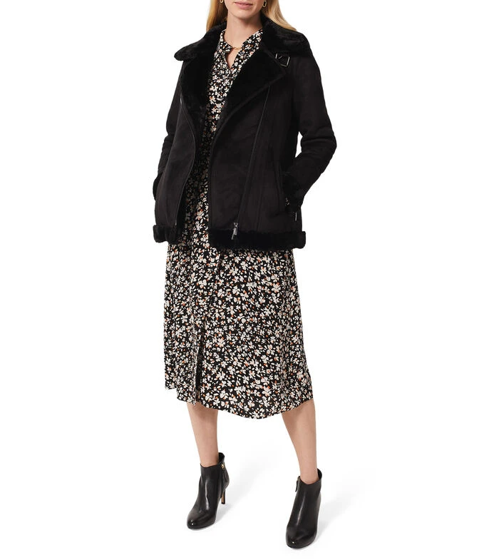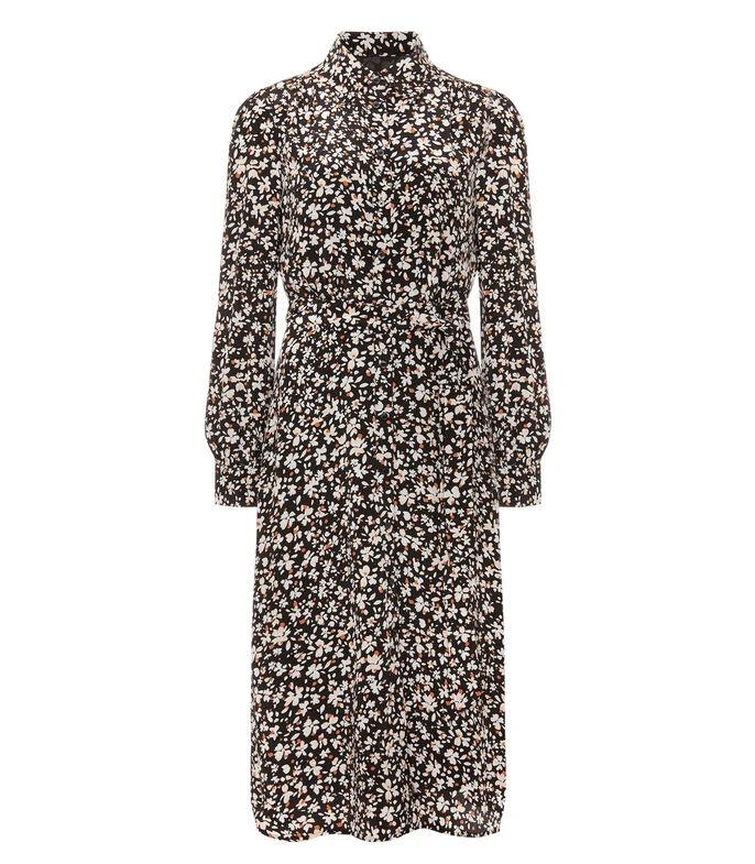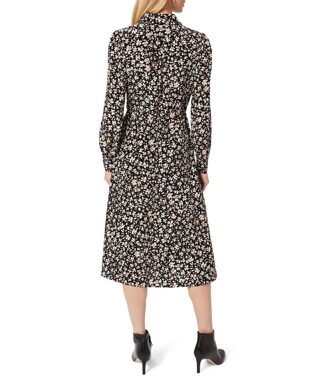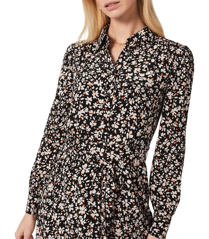 Vestido Hobbs largo de corte A en tejido de punto con diseño de margaritas en mosaico, cuello V, manga larga y cinta decorativa a tono en la cintura.