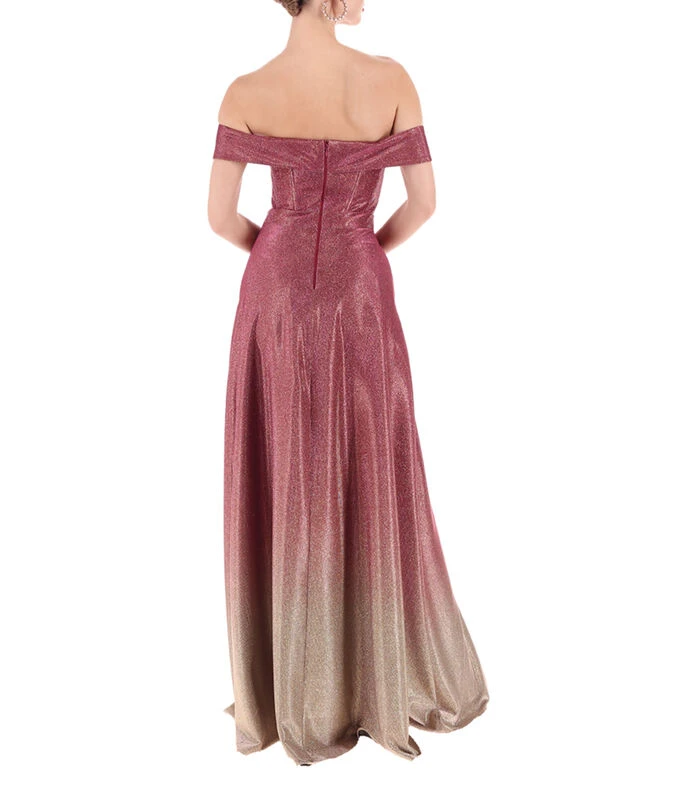 Vestido Massima maxi de corte evasé en tejido de punto, cuello strapless, sin mangas, abertura central superior, abertura en la parte baja, cierre de cremallera en la parte posterior y acabado abrillantado.