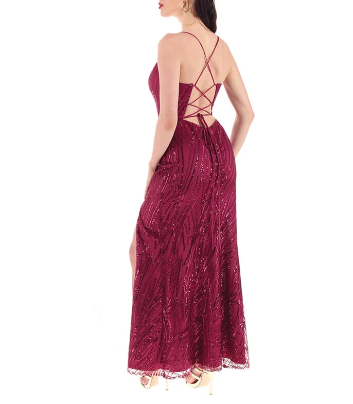 Vestido Massima maxi de corte recto en tejido de punto, cuello V, sin mangas, tirantes delgados con un cruce en la parte posterior y ajustable en la cadera; detalle de transparencia al centro, sutil abertura en parte baja y detalle de líneas abrillantadas.
