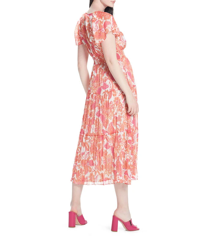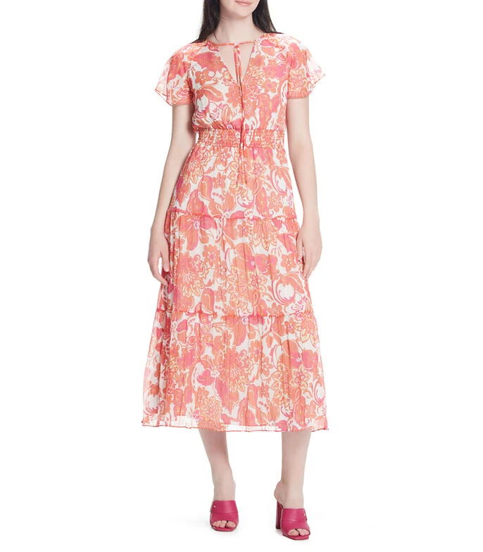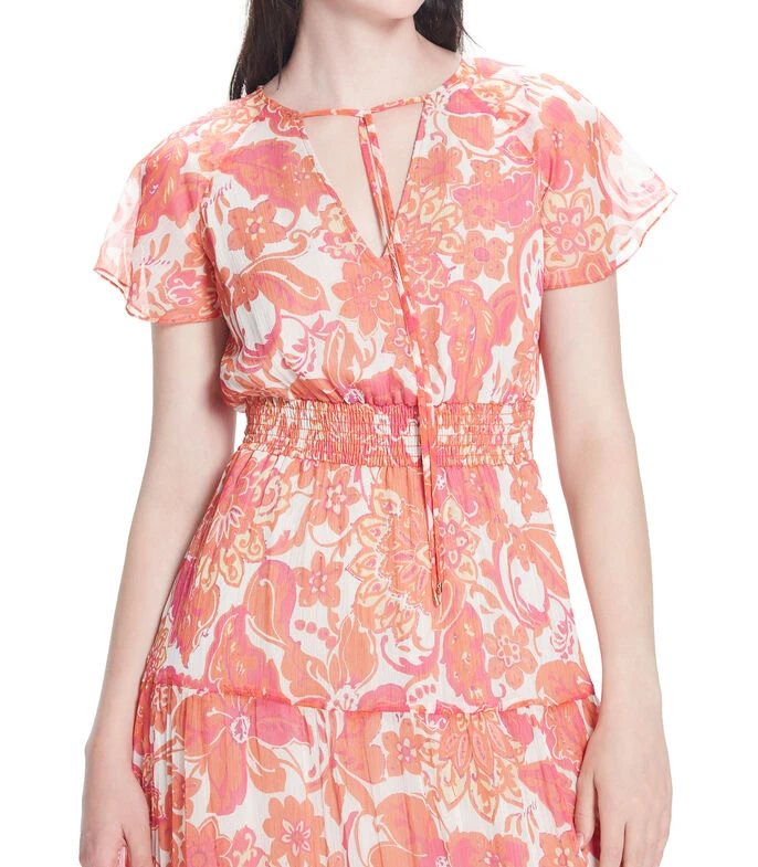 Vestido Julio Maxi de corte evasé, escote V con abertura y lazo de amarre. Cintura elástica. Manga corta ranglan con volante. Bolsillos en costados. Chifón corrugado maxi floral. Forro interior.