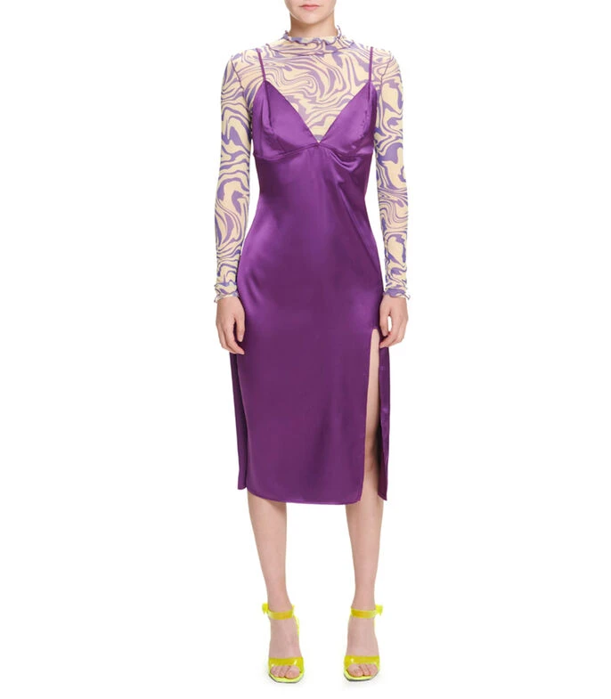 Vestido Unfollow maxi estilo lencero de corte regular en tejido de punto satinado con tirantes ajustables. Faldón con abertura y ajuste elástico en parte posterior.