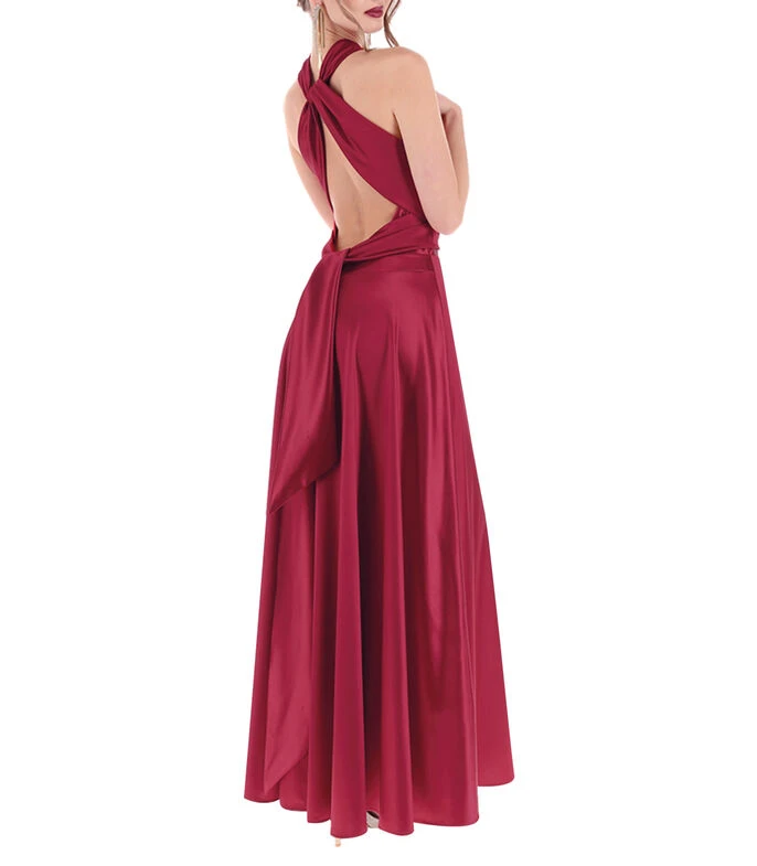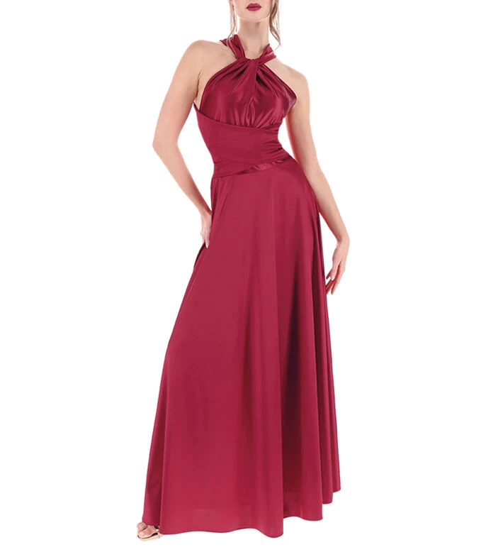 Vestido Massima maxi de corte evasé en tejido de punto, cuello halter, sin mangas, tirantes largos que cruzan en cintura formando fajilla, en la parte trasera cubierta por tirantes.