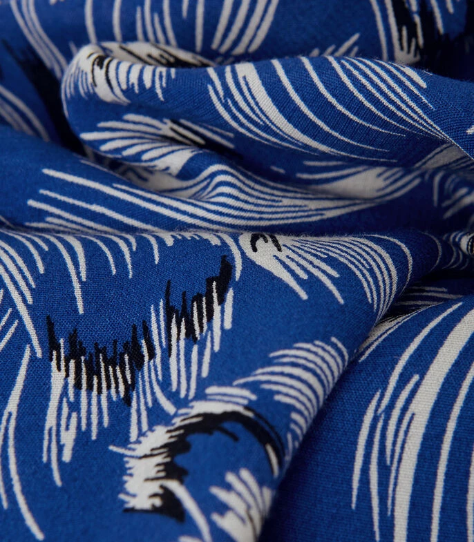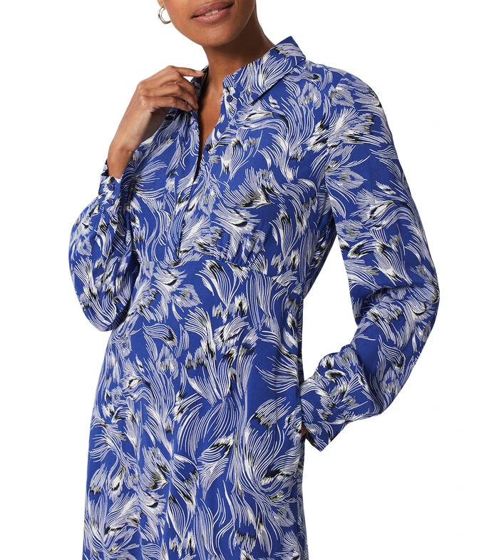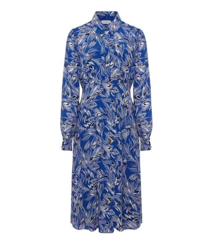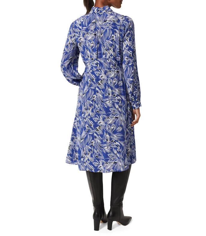 Vestido midi Hobbs tipo camisero de corte recto en tejido de punto con estampado de plumas pictóricas, cintura ceñida, detalle de pliegues y medio cierre de cremallera.