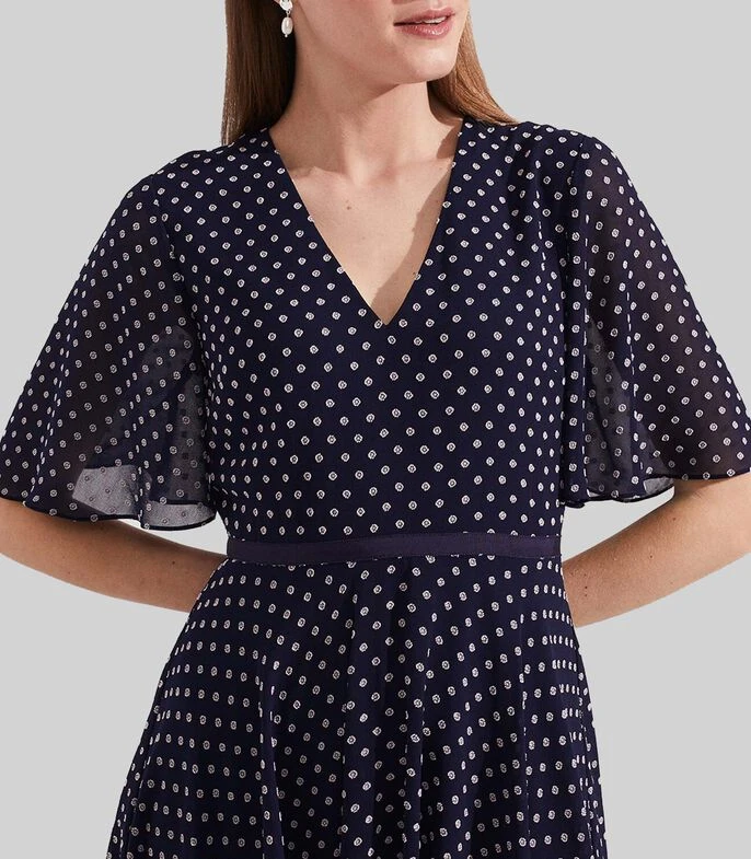 Vestido Hobbs Midi, de corte A en tejido de punto, cuello V, manga 3/4 acampanada con semi transparencia, micro diseño a contraste, cuello V, cinta en cintura y fondo a tono.
