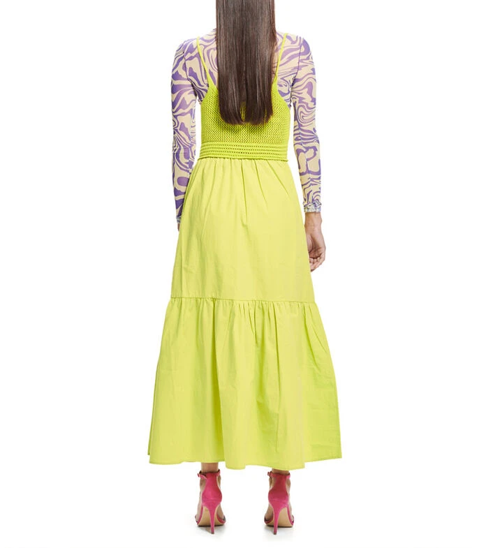 Vestido largo Unfollow de corte A en tejido de punto, cuello V, tirantes, borde superior tipo crochet, faldón de popelina en paneles a tono.