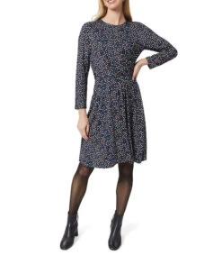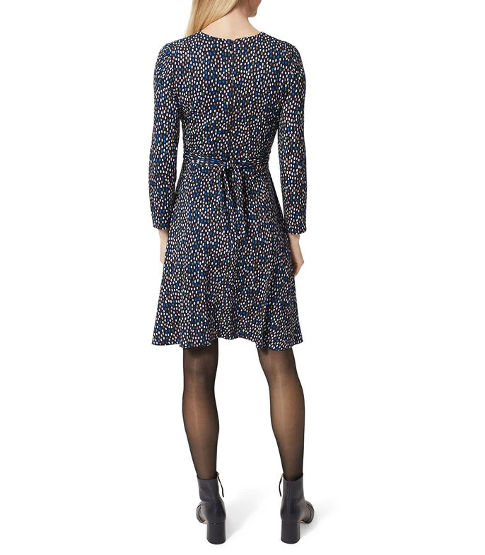 Vestido Hobbs midi de corte A en tejido de punto con polkadots, manga larga, cuello redondo y acabado fruncido decorativo en la cintura.