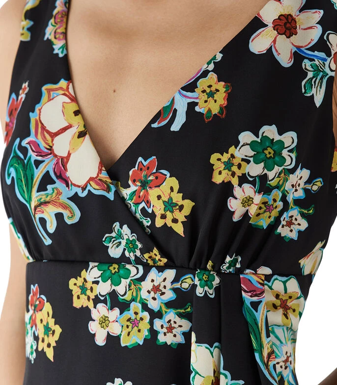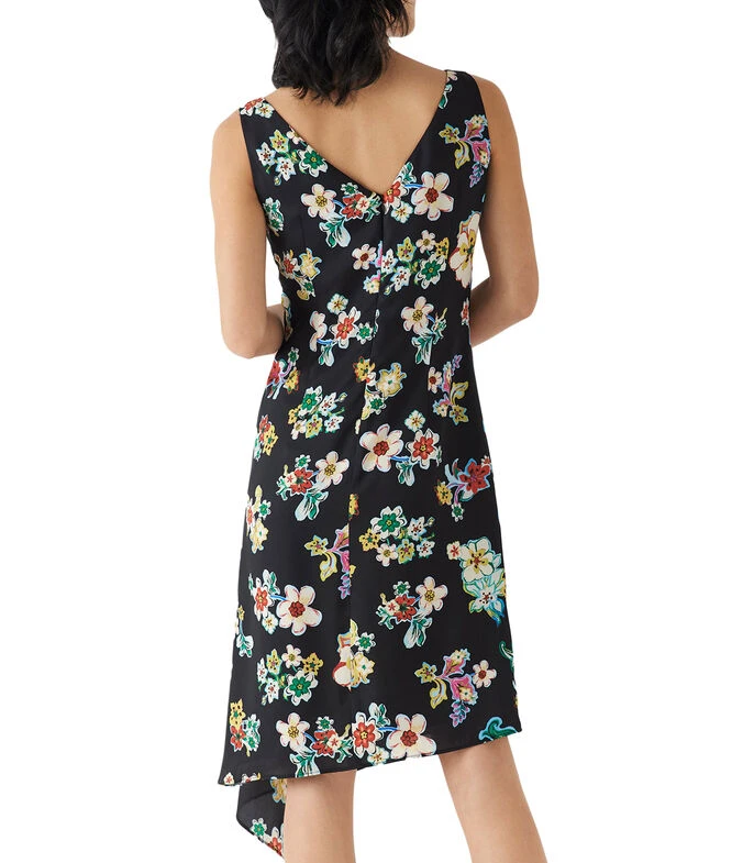 Vestido Roberto Verino midi de corte recto en tejido de punto, con estampado floral multicolor. Escote V cruzado al frente y detrás, ceñido en pecho y con pieza de tela fruncida sobre el cuerpo montada a modo de sobrefalda con largo asimétrico. Cierre con cremallera invisible en centro espalda.