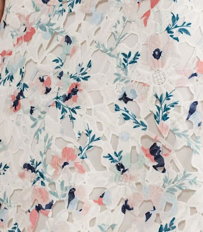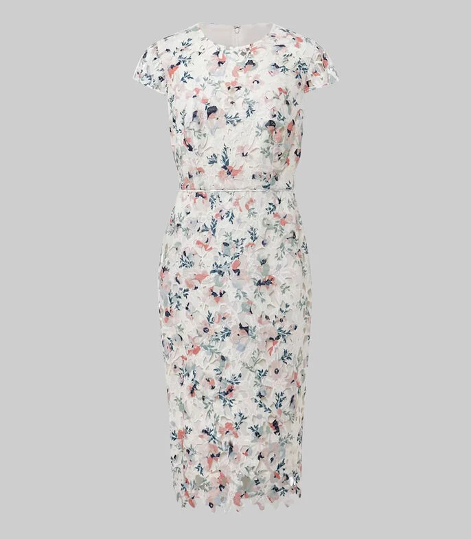 Vestido Phase Eight midi, de corte recto en tejido de punto, cuello redondo, manga corta, estampado floral con detalle de encaje y cierre de cremallera en la parte trasera. El vestido perfecto para tu próxima ocasión.