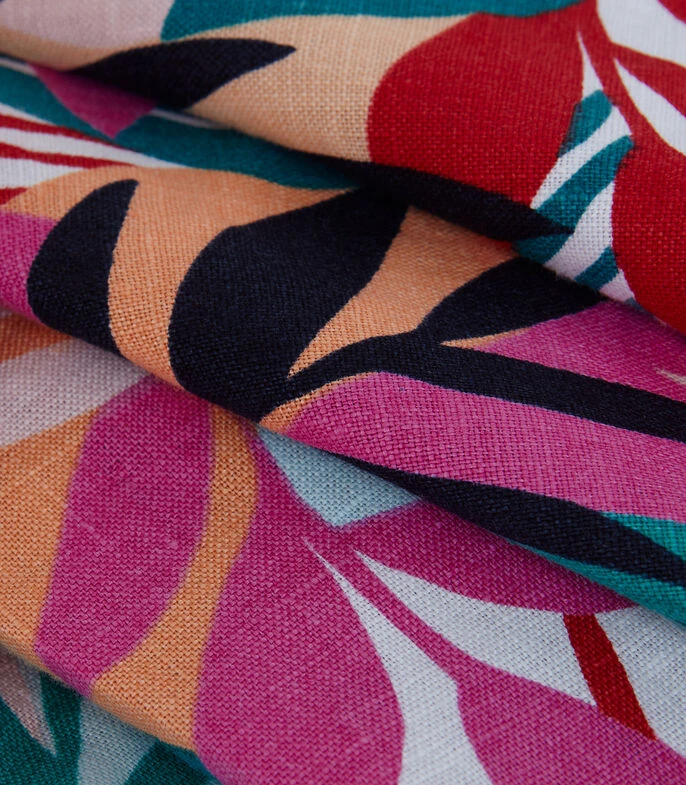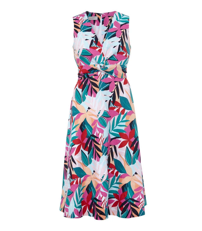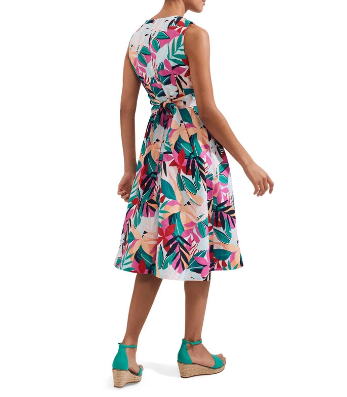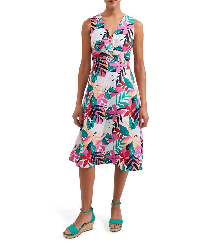 Vestido Hobbs midi de corte A en tejido de punto con diseño de plantas en mosaico, sin mangas, escote V y acabado fruncido decorativo en el pecho.