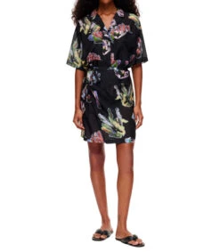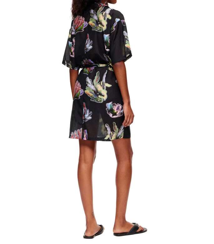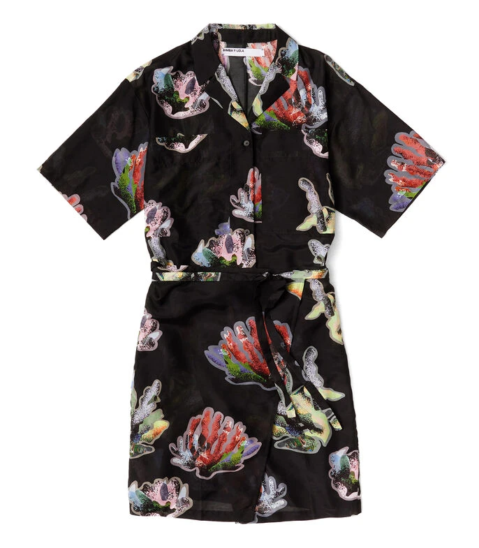 Vestido Bimba y Lola mini de corte recto en tejido de punto, cuello camisero con botonadura al frente, manga corta, estampado Coral en a contraste y cinta anudable en cintura.