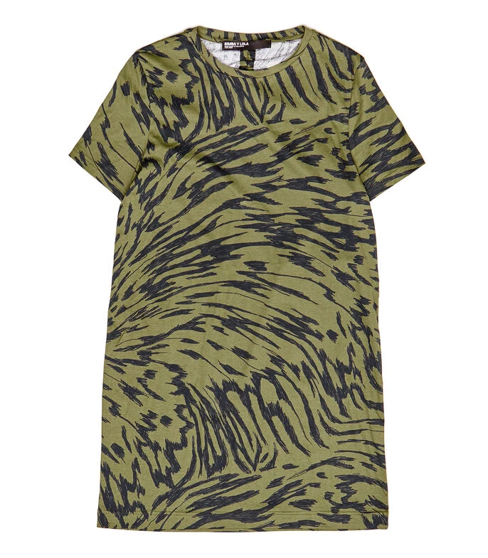 Vestido Bimba y Lola corto de corte recto en tejido de punto, diseño tipo animalprint, cuello redondo, manga corta y abertura en espalda con jareta.