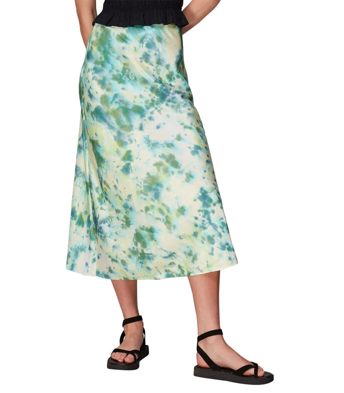 Falda larga Whistles de corte «A» en tejido de punto satinado, estampado tipo Tie Dye multicolor.