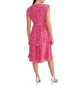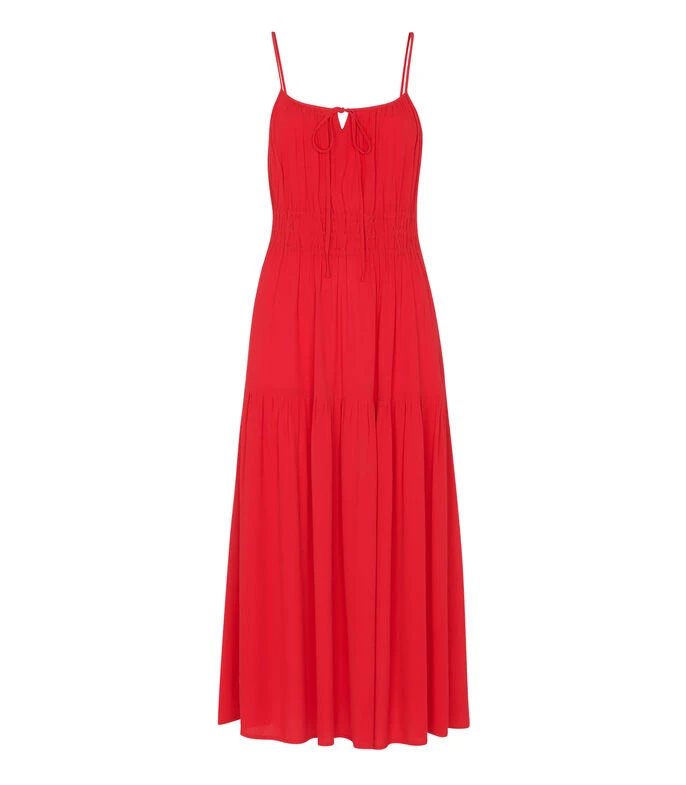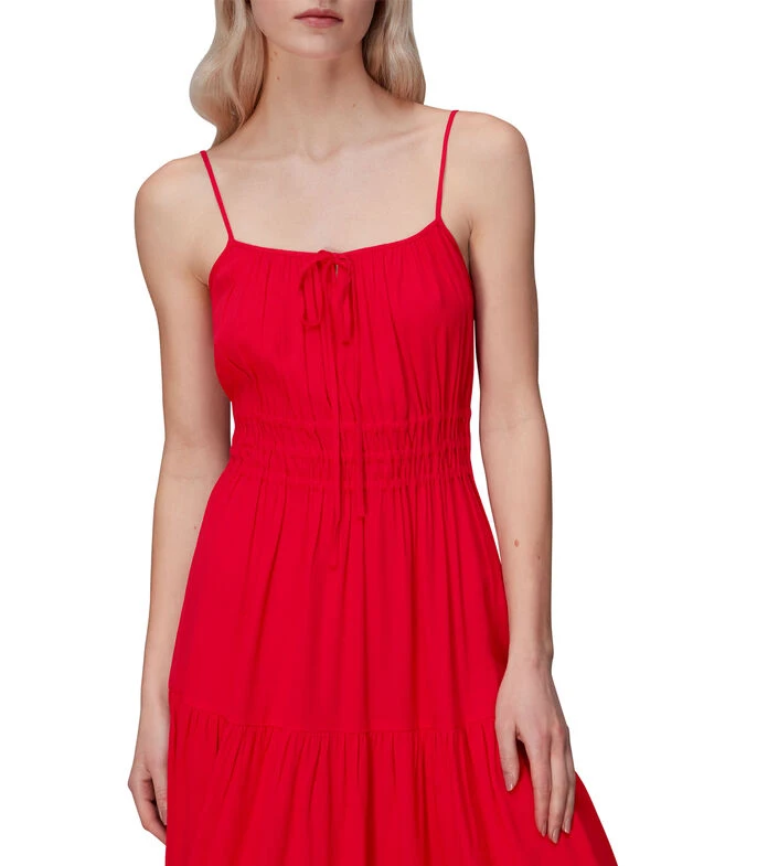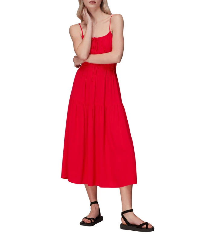 Vestido midi Whistles de corte «A» en tejido de punto rojo con tirantes finos ajustables, listones en escote y detalles fruncidos.