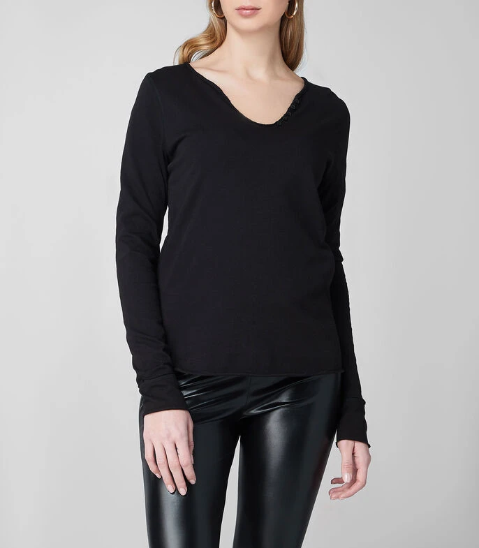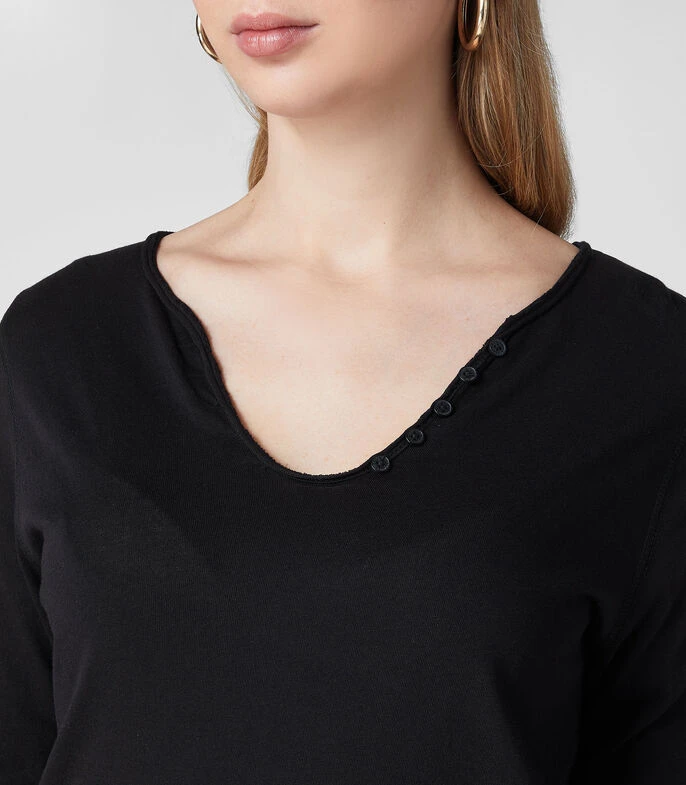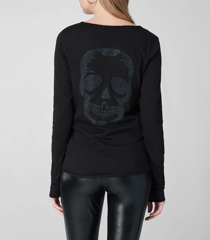 Playera Zadig & Voltaire de corte regular en tejido de punto, cuello V con botones decorativos en borde, manga larga y estampado de calavera en la parte posterior.